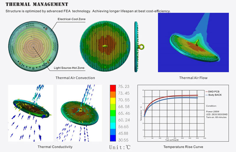 *High Efficiency Chips: Our UFO LED high bay lights use high brightness SMD 2835 LED chips, uniform light, no dark angle, low light decay, energy saving and environmental protection.
